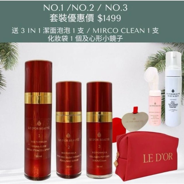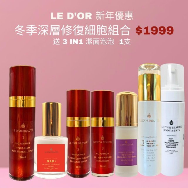 LE D'OR 新年超級優惠最強去斑組合A:1:瑞士水潤光采噴霧,2:無瑕光亮精華,3:膠原滋養乳霜,4:全新升級3重幹細胞升級去斑精華,5:送3 IN1 潔面泡泡 1支